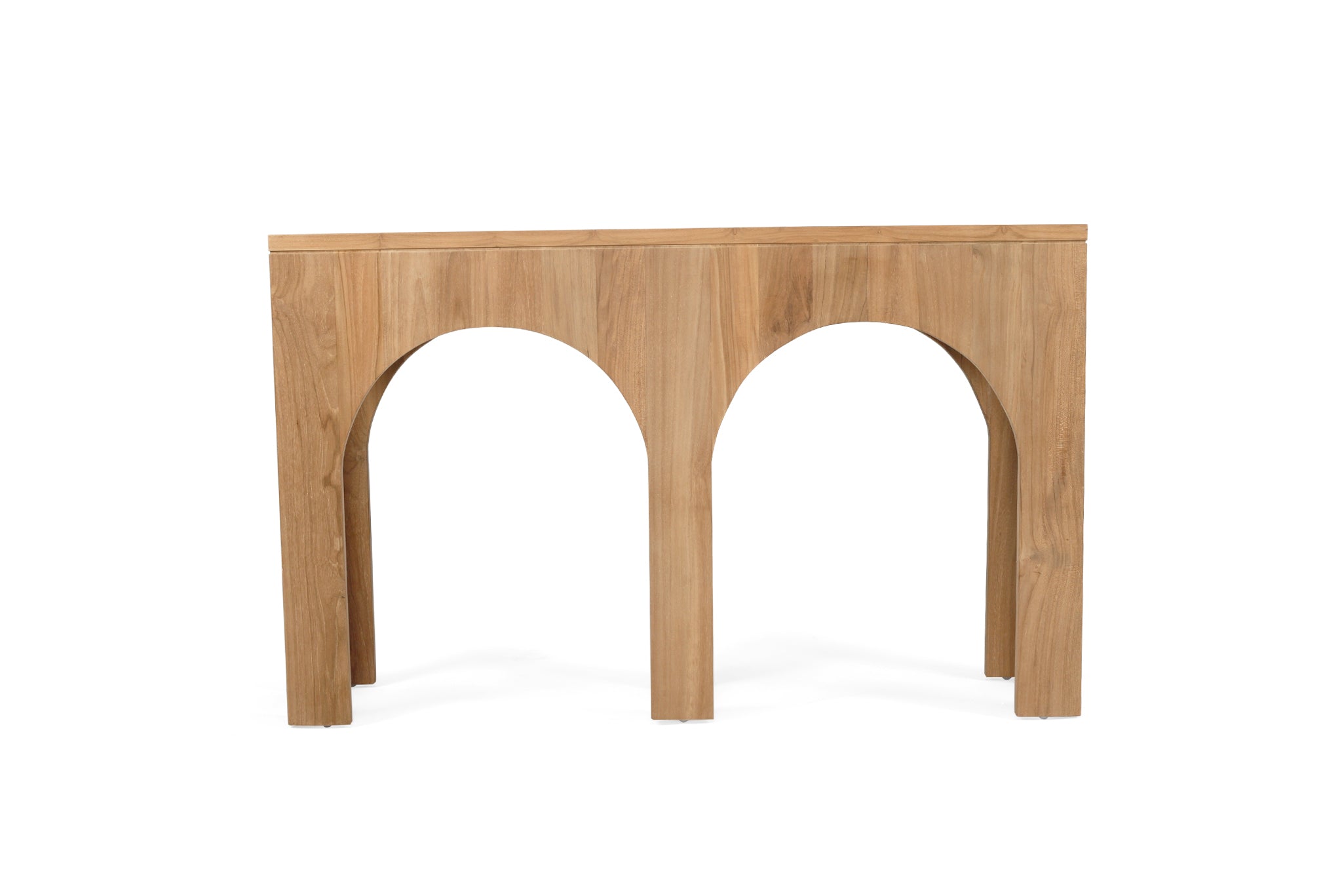 The Isolde Console Table showcases organic hand cut arches set in the the raw beauty of solid handcrafted teak wood.