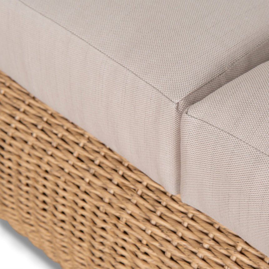 The Palisade Outdoor 3 Seater Sofa seamlessly blends coastal charm with modern durability. Featuring natural taupe polyester upholstery and an intricately woven frame, it offers both comfort and elegance, making it a perfect addition to any outdoor living space.